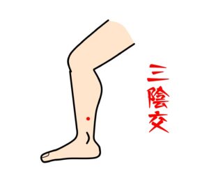 内くるぶしの一番高いところから、指4本分上(すねの骨の後ろ側)にあります。女性特有の不調や冷え性にも効果的とされる万能なツボです。親指でゆっくりと押したり、温めたりすると良いでしょう。